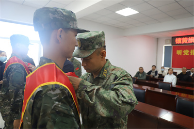 現(xiàn)場,身著嶄新軍裝的新兵身姿挺拔、精神抖擻。授紅花環(huán)節(jié),人武部、公安局、民政和退役軍人事務(wù)局領(lǐng)導(dǎo)依次上前,為新兵佩戴象征光榮與使命的大紅花,花團(tuán)映著堅毅面龐,瞬間點燃他們投身軍旅的熱血豪情。專武干部則為新兵肩扛綬帶,這既是新兵身份轉(zhuǎn)變的鮮明印記,更承載著對他們建功軍營的殷切期盼。