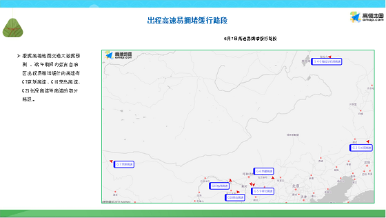 根據(jù)高德地圖交通大數(shù)據(jù)預(yù)測(cè) ,端午期間內(nèi)蒙古自治區(qū)返程易擁堵緩行的高速有G7京新高速、G18榮烏高速、G16丹錫高速等高速的部分路段。