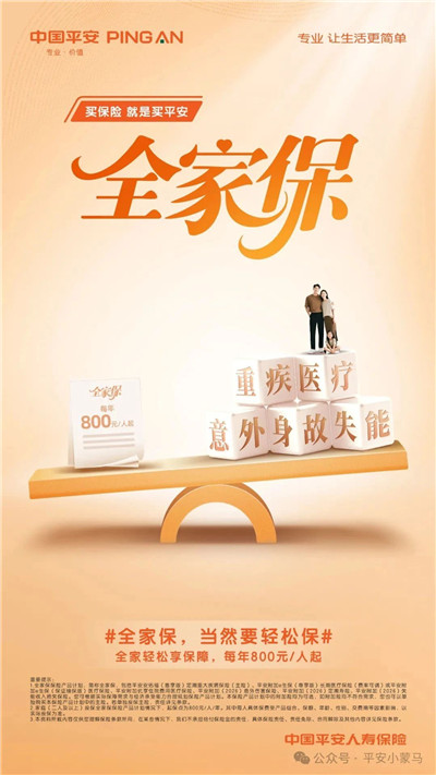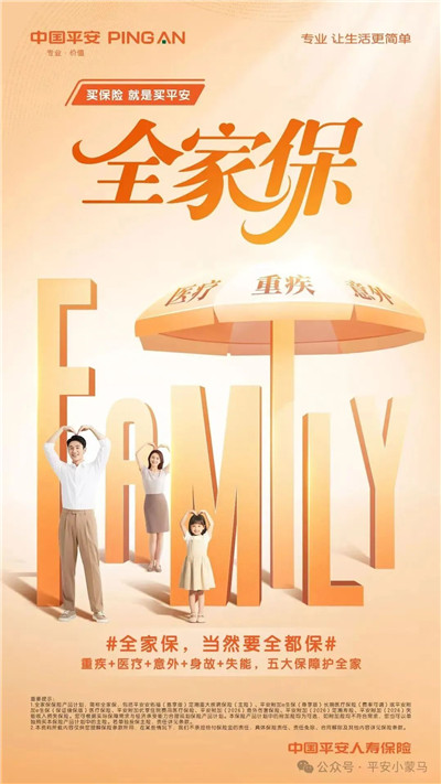 ①全家保保險產品計劃,簡稱全家保,包括平安安佑福(惠享版)定期重大疾病保險(主險,簡稱安佑惠享定期)、平安附加e生保(尊享版)長期醫(yī)療保險(費率可調)(簡稱e生保尊享版)或平安附加e生保(保證續(xù)保版)醫(yī)療保險(簡稱e生保續(xù)保版)、平安附加優(yōu)享住院費用醫(yī)療保險(簡稱優(yōu)享醫(yī)療)、平安附加意外傷害醫(yī)療保險(B)(簡稱意外醫(yī)療B )、平安附加(2026)意外傷害保險(簡稱附加意外26)、平安附加(2026)定期壽險(簡稱附加定壽26)、平安附加少兒(2021)定期壽險(簡稱少兒定壽21)、平安附加(2026)失能收入損失保險(簡稱附加失能26)。您可根據實際保障需求與經濟承受能力合理規(guī)劃保險產品計劃。本保險產品計劃中的附加險均為可選,如附加險均不符合需求,您也可以單獨購買本保險產品計劃中的主險。若單獨投保主險,責任詳見條款。②本文所稱重疾指安佑惠享定期合同約定的120種重疾,等待期90天。發(fā)生合同條款約定的重疾按100%基本保險金額給付重疾保險金。重疾保險金限給付1次,給付后身故金不再給付。③百萬醫(yī)療保障由e生保尊享版提供。具體責任詳見條款。保額400萬指e生保住院醫(yī)療保障最高400萬。④住院費用保險金由優(yōu)享醫(yī)療提供。給付被保險人因意外傷害或30天等待期后因疾病經醫(yī)院診斷必須住院治療的,符合條款約定的住院醫(yī)療費用。本附加險的年度給付限額為1萬元。具體責任詳見條款。⑤家庭(2人及以上)投保全家保保險產品計劃情況下,起保點為800元/人/年。其中每人具體保費受產品組合、保額、年齡、性別、交費期等因素影響,以實際投保為準。⑥本文所載內容僅供您理解保險條款所用,在某些情形下,我們不承擔給付保險金的責任。具體保險責任、責任免除、合同解除及其他內容詳見保險條款。