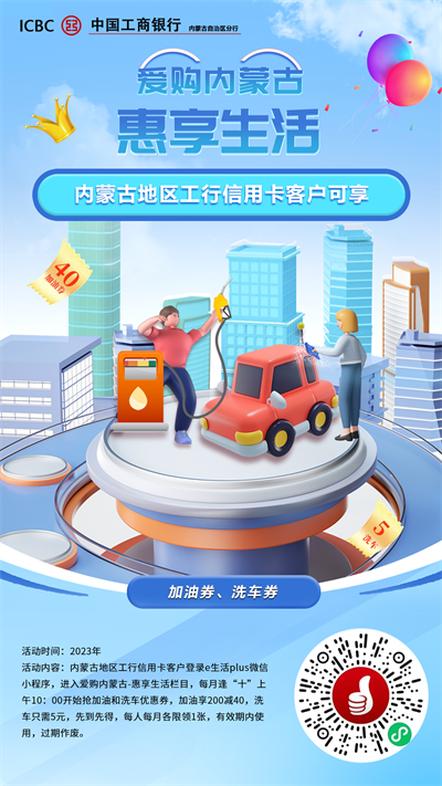 每月10日、20日、30日上午10:00,內(nèi)蒙地區(qū)工行信用卡客戶可在“e生活PLUS”微信小程序“本地專屬”-“愛購內(nèi)蒙古-惠享生活”活動頁面領(lǐng)取40元加油券和洗車券,加油券有效期內(nèi)到內(nèi)蒙古地區(qū)中國石油各加油站加油時,使用微信綁定工行信用卡實(shí)際支付滿200元即可立減40元;洗車券有效期內(nèi)在活動頁面使用工行信用卡實(shí)際支付5元即可享受洗車權(quán)益1次。加油券和洗車券每位客戶每月各可領(lǐng)取一次,數(shù)量優(yōu)先,先到先得。