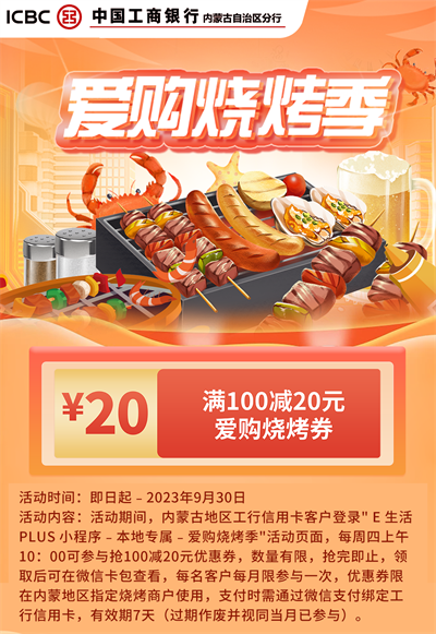 至9月30日每周四上午10:00,內(nèi)蒙古地區(qū)工行信用卡客戶可在“e生活PLUS”微信小程序“本地專屬”-“愛購燒烤季”活動頁面領(lǐng)取20元燒烤券,有效期內(nèi)在全區(qū)各盟市指定燒烤商戶消費(fèi)時使用微信綁定工行信用卡支付,即可享受滿200元立減20元優(yōu)惠。每位客戶每月可領(lǐng)取一次,數(shù)量優(yōu)先,先到先得。
