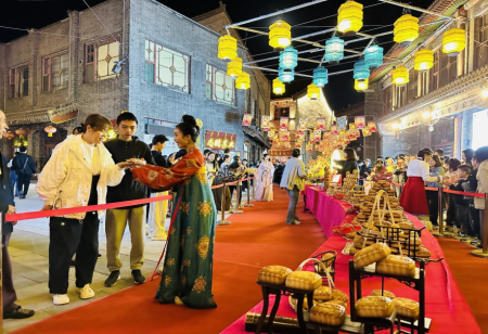 范佳辰:“雙節(jié)期間,包頭金街共有八大活動,包括月下解謎互動游、金街賞月拍照集贊、老字號月餅打卡游、中秋祈福掛牌游等,祭月大典是我們中秋專門定制的這么一個活動,我們準備了1萬塊月餅,市民朋友參加活動,可以免費領一塊月餅,我們會有連續(xù)八天的金街音樂周,每一天都有對應的主題,包括專場樂隊演出,老戲臺還有電影放映?!?/span>