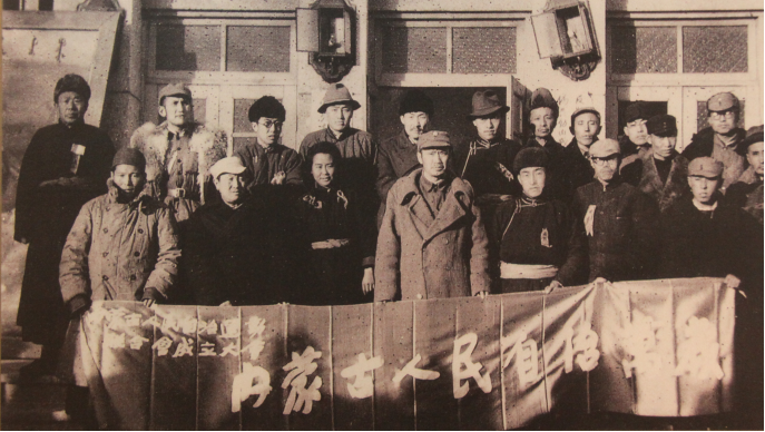 男:“內(nèi)蒙古民族徹底解放的先鋒”,晉察冀中央局贈送給大會的賀幛上這12個大字,是對出席內(nèi)蒙古自治運動聯(lián)合會成立大會全體代表的高度評價,也是對他們提出的要求和希望。
