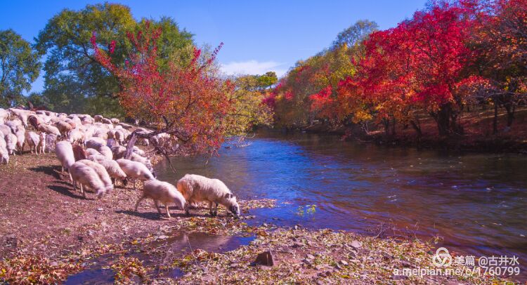 更使我鐘情的是,像一條玉帶從遠處的山巒密林中飄出,一直伸向草原深處的提林河。河岸上紅艷似火的楓葉、綠中透黃的柞葉、搖曳生輝的柳枝、還有醉熟的灌木和衰黃的草叢,把提林河兩岸裝點的如火如荼、如詩如畫,讓人如癡如醉。