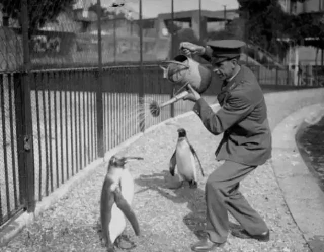飼養(yǎng)員在給企鵝人工降雨