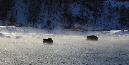 不凍河的神奇之處還在于,她是一個天然的冬季水中牧場,當(dāng)莽原被冰雪厚厚的覆蓋,不凍河里卻綠意盎然,水草豐茂。無處覓草,饑腸轆轆的牛兒,天一放亮就迫不及待地奔赴河中,盡情享用這嚴(yán)冬中只有這里才會有的鮮嫩大餐,生長在這里的牛兒竟然也這樣得天獨厚。