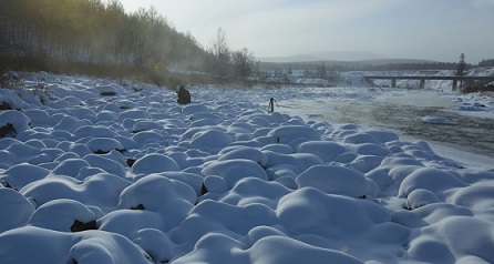 不凍河的神奇之處是,處于高寒地區(qū)的阿爾山每到冬季,滴水成冰,冰凍三尺??勺呓@段河流便頓覺來到了世外桃源,河中水流潺潺,氤氳蒸騰;兩岸的樹木冰清玉潔,枝椏晶瑩;就連樹下的枯草也潔白剔透,充滿了靈性;再看河床水中裸露的巖石,像裹上了一層厚厚的棉絮,一朵朵、一簇簇,如動物似蘑菇……,各式造型可讓你充分展開想像的翅膀暢游其間、樂在其中。