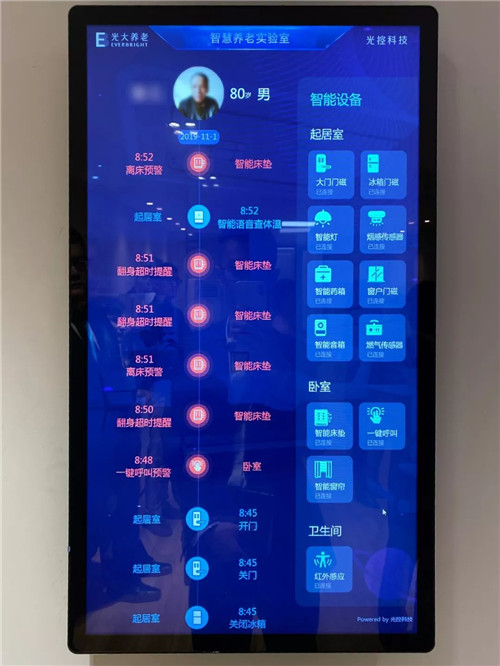 當(dāng)天,李曉鵬、吳利軍、蔡允革、付萬(wàn)軍一行還參觀了光大養(yǎng)老智慧養(yǎng)老實(shí)驗(yàn)室。通過(guò)智能設(shè)備,構(gòu)建云服務(wù)平臺(tái)、物聯(lián)網(wǎng)智護(hù)平臺(tái)和AI大數(shù)據(jù)三大技術(shù)平臺(tái),可全天候監(jiān)測(cè)入住老人的健康數(shù)據(jù)、屋內(nèi)設(shè)備運(yùn)轉(zhuǎn)情況、冰箱開(kāi)關(guān)情況等,提供健康服務(wù)、安全服務(wù)、護(hù)理服務(wù)、輔助服務(wù)四類(lèi)核心養(yǎng)老服務(wù),用有溫度的科技守護(hù)老人的健康安全。