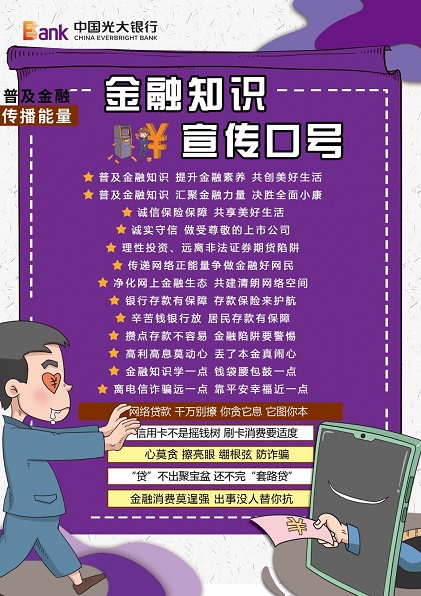 為持續(xù)推動金融知識普及和金融消費者教育工作,提高消費者金融素養(yǎng)及金融風險防范意識,中國光大銀行呼和浩特分行持續(xù)推動金融消費者教育、金融知識普及活動。該行制定了詳細的活動方案,全面發(fā)動線上線下做好金融知識宣傳,積極維護消費者權益—受教育權。